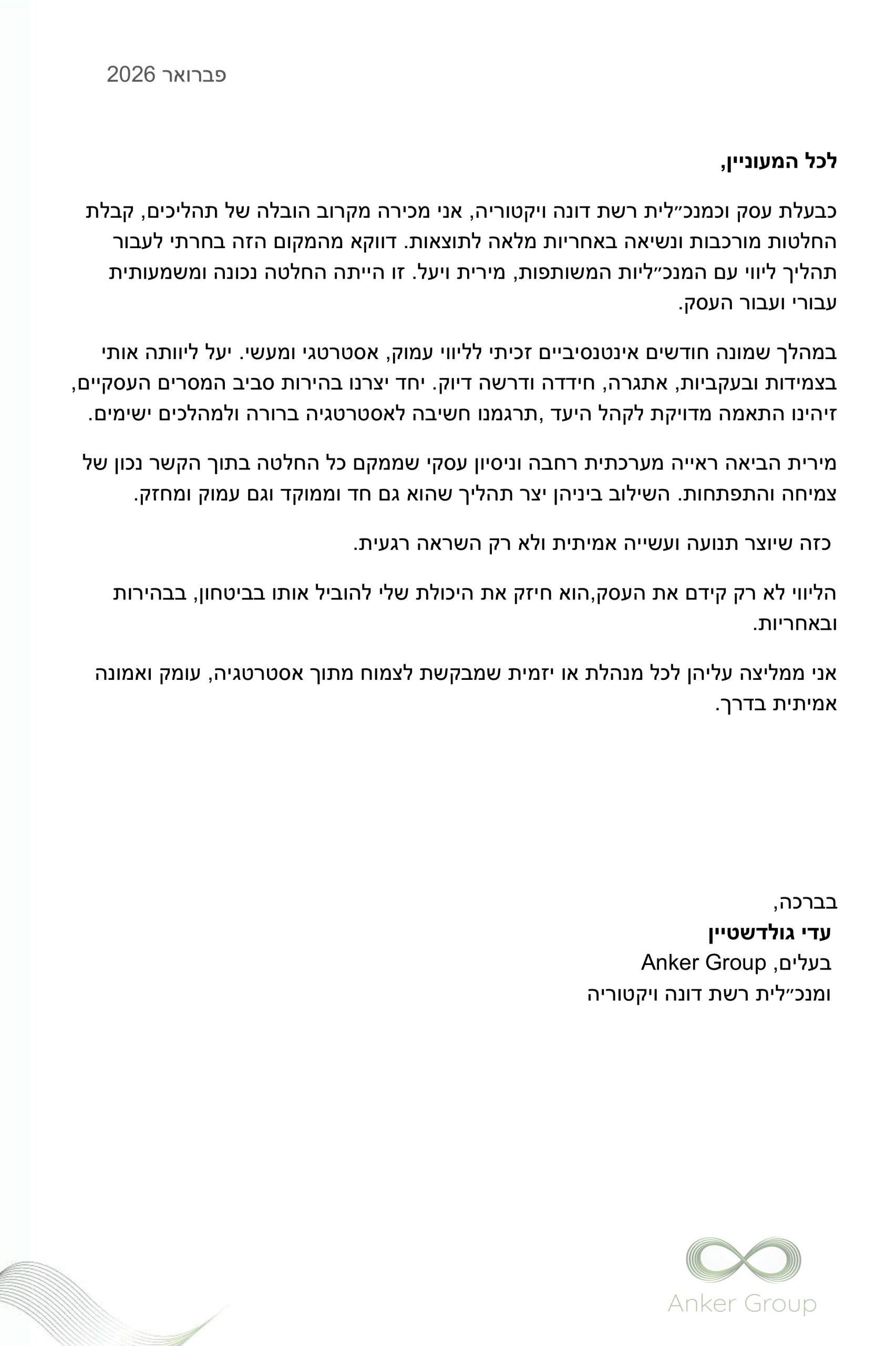 הניסיון לימד אותנו ששותפות ניהולית צריכה להיבנות בהקשבה ובהבנה עמוקה של הארגון.